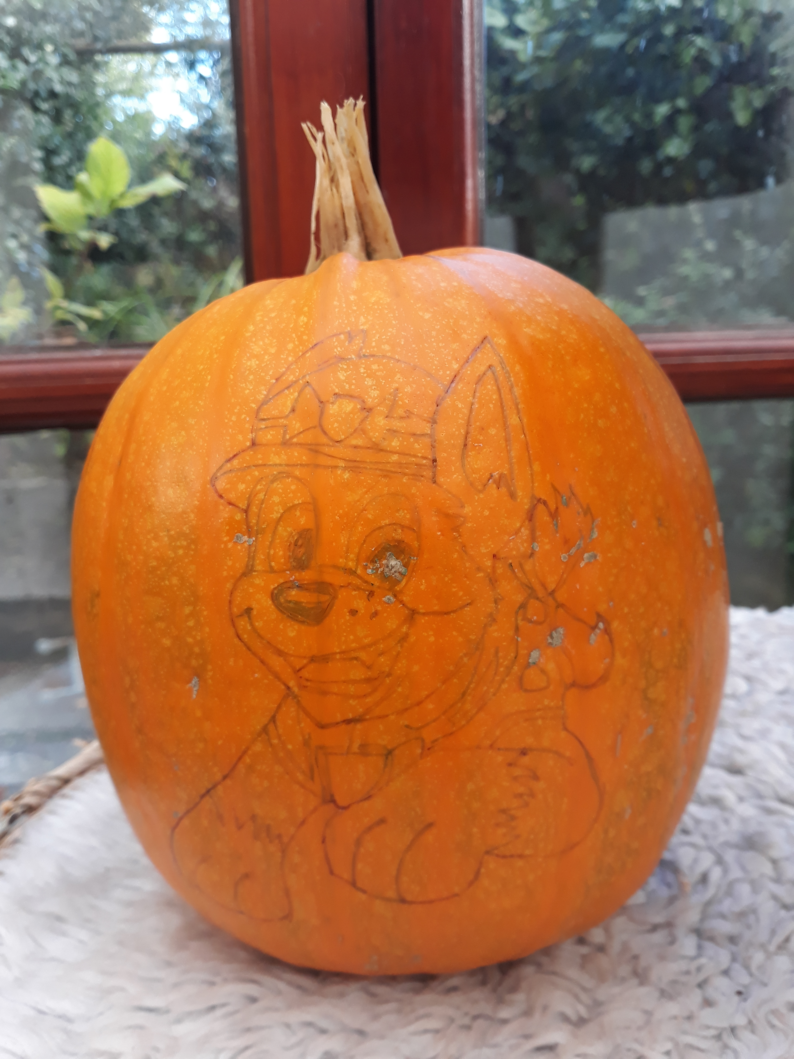 September has always been a poignant time of year for me. Maybe it’s the hangover from going back to school/college/university, exacerbated now by walking my own little boy to school. Owls are still hooting at quarter to six in the morning; the leaves are flame-like; the hawthorn berries and blackberries that haven’t been eaten, are shrivelling on their branches. Our pumpkin has already grown and turned orange, its stalk and leaves have melted into the damp earth, and my little boy brought it inside this afternoon. I was obliged to draw Chase from PAW Patrol on it. And I have labyrinthitis, which means my whole world is spinning, and everything feels unreal.