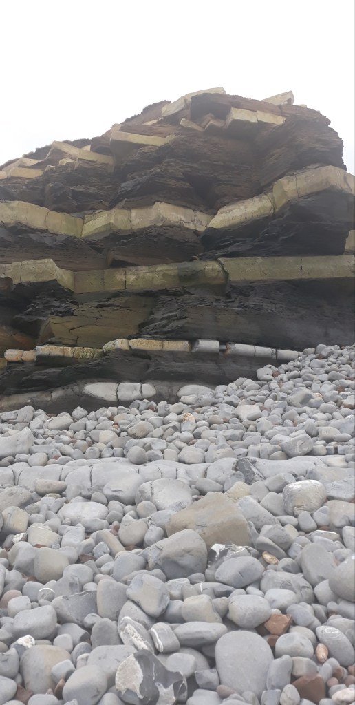 The low cliffs are layered like Liquorice Allsorts. Liam’s stumbling over terrain which is literally rocks and boulders, slipping on seaweed in his chequered espadrilles in pursuit of Richard.