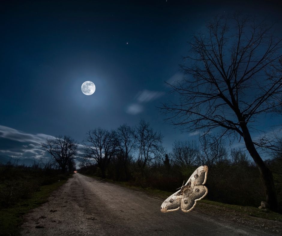 They need (moon)light to navigate their lives, even to the point of perceiving which way is up. Presumably, they recognise the cold quality of the light of the moon. Yet, in the early morning, as I commute through country lanes under a clear January sky, while the moon sits on high, moths fly into my headlights. Even LEDs aren’t moon-cold in their appearance. In the dark of winter, and in the corridor between hedges, moths show up almost gold in the electricity-produced tunnel of my headlights. The moon is high and still, gazing; my synthetic light is low and dynamic, looking. The golden moths flitting about their business, change their course, and turn to my on-coming car. If the moth is large, and I am driving in silence, its death is audible.